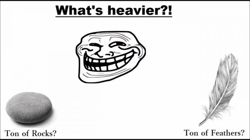 - رغم أن طن الحجر يتساوى في الوزن مع طن الريش .إلا أن الريش سيأخذ مساحة أكبر بكثير رغم ذلك يكون للريش كثافة أقل من الحجر (بمعنى أن الريش أقل ثقلاً لنفس الحجم).