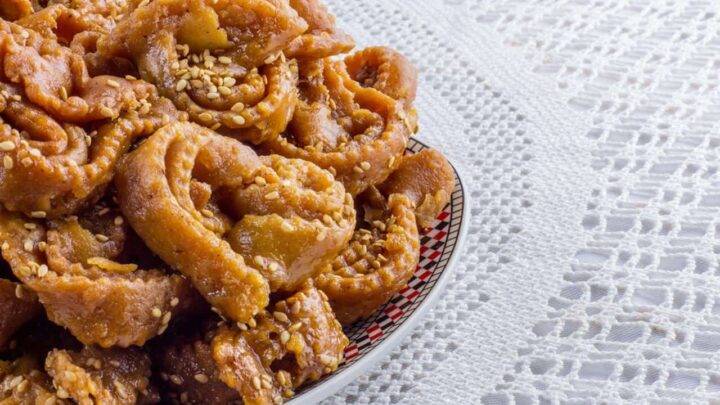 - الشباكية عبارة عن شرائح من العجين ملفوفة على شكل وردة أو عين، وهي مقلية ومغموسة في العسل ومزينة ببذور السمسم.