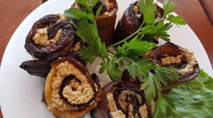 يتكون الطبق من؛ ثمار الباذنجان المحشوة بمعجون الجوز، وتزين من الأعلى ببذور الرمان الشهية.