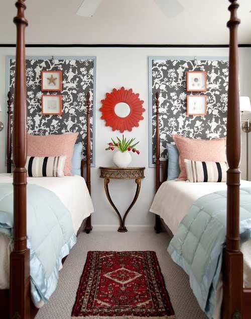 أطوال من ورق الجدران مع جدار خشبي أساسي لتشكيل اللوح الأمامي من زوج من أربعة ملصقات في غرفة النوم هذا ما تحتاجه. تم استخدام ورقة F Schumacher رائعة هنا، يمكنك استغلال الباقي في تغليف هدايا جميلة للغاية للحصول على ميزانية تأخذ هذا المظهر.