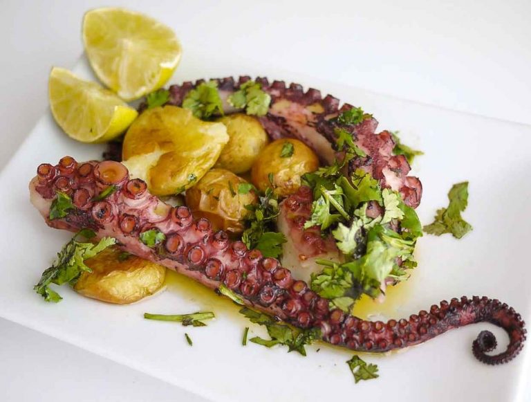 يتم سلق الأخطبوط بأكمله، بعد ذلك يقطع، ويوضع في الفرن مع الكثير من الثوم، وزيت الزيتون.