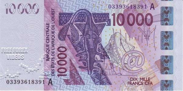 توجد العملات المعدنية من فرنك غرب أفريقيا CFA في أشكال 1 و 5 و 10 و 25 و 50 و 100 و 200 و 250 و 500 فرنك. وتوجد العملات الورقية للفرنك الأفريقي لغرب أفريقيا في شكل 500 و 1000 و 2000 و 5000 و 10،000 فرنك.